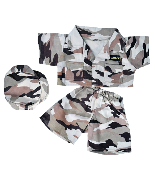 🧸 Military-Inspired Plush – Brown bear plush wearing a detailed desert camouflage outfit complete with badge.