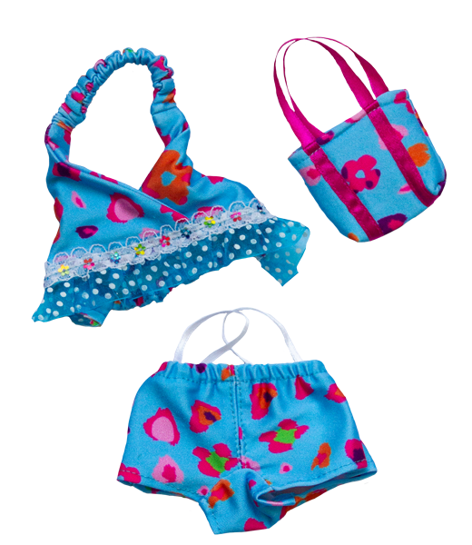 8-inch Brown Patches Bear dressed in a blue floral tankini with matching bag